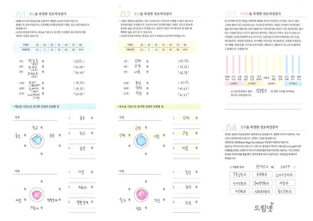 - 재능, 본능, 가치관, 성격, 정체성, 희망계열과 학과